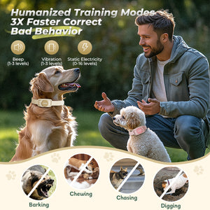 Beep (1–3 levels) Vibration (1–3 levels) Safe Static Shock (0–16 levels) The collar remembers your last setting for seamless training each time.